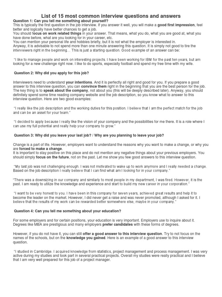 Common Interview Questions And Answers. To answer, share qualities and personal attributes and then relate them. Short hint explains what the interviewers try to find out with the question, and how you should answer it.